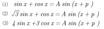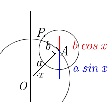 the function; y = a sin x + b cos x The angle OAP is always 90 degrees. When the figure OAP rotates arround the origin, the y-coordinate of point P represents the function. |